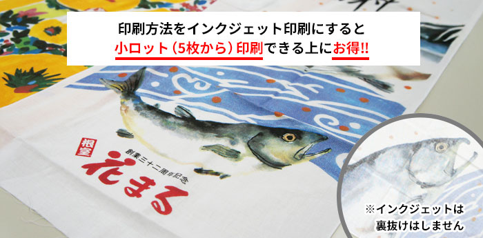・30枚以上から注文可能な「伝統的な染色技法(反応染め・注染)」。風合いに優れた本格仕様です。